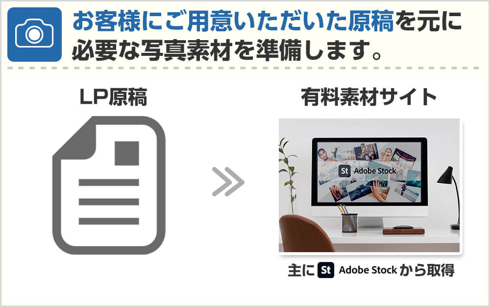 ご用意頂いた原稿を元に、デザインで必要な写真素材やイラスト素材はAdobe Stockという有料素材サイトより準備させていただきます。